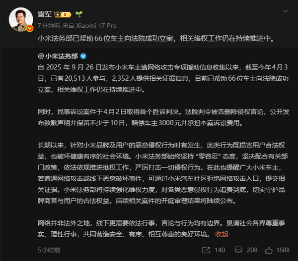 据CNMO了解,截至2026年4月3日,专项援助信息收集活动累计已有20513人参与,其中2352人提供了相关证据信息。法务部在筛选和核实后,已成功帮助66位车主向法院提起诉讼并完成立案。与此同时,民事诉讼工作于4月2日迎来首个胜诉判决:法院判令被告删除所有侵权言论,公开发布致歉声明且保留不少于10日,赔偿车主3000元并承担本案全部诉讼费用。这一判例被视为小米针对恶意网络攻击行为法律维权的标志性突破。